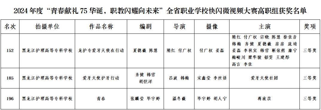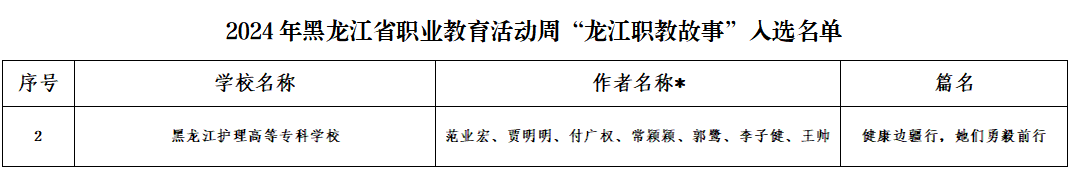 根据黑龙江省教育厅等十一厅局《关于做好 2024 年黑龙江省职业教育活动周相关工作的通知》(黑教联〔2024〕34 号)和省职教学会《关于征集“龙江职教故事”的通知》《关于举办 2024 年度“青春献礼 75 华诞,职教闪耀向未来”全省职业学校快闪微视频大赛的通知》的总体部署,经省职业教育学会组织专家对作品进行遴选评审,我校作品《健康边疆行,她们勇毅前行》在32个入选龙江职教故事的作品中排名第二;快闪作品《龙护专爱牙天使在行动》《爱牙天使护牙行动》《青春》获闪微视频大赛三等奖。