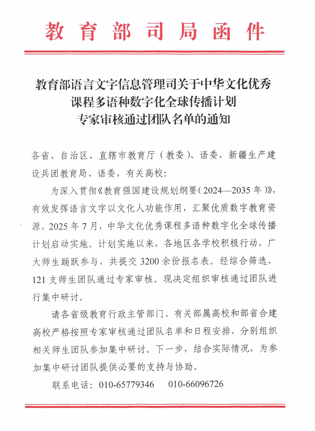 近日,经教育部专家严格评审,由我校教务处仇方元领衔,周振、李思璇、冯浩洋、丛春雨共同组成的项目团队,从全国众多申报团队中脱颖而出,成功通过审核,成为该项目全国121支入围团队之一,标志着我校在中华文化国际传播领域的实践与探索获得国家级认可。